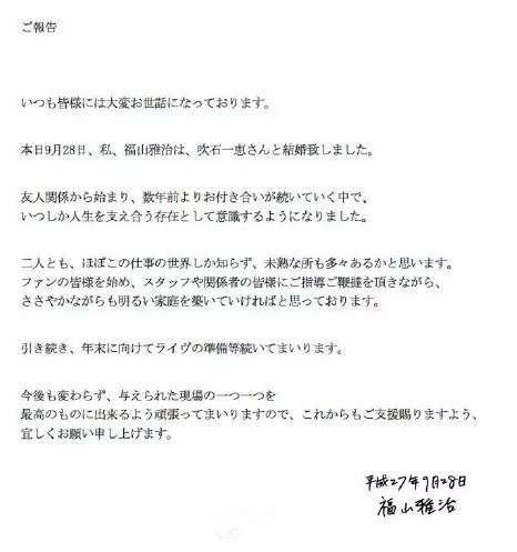 福山雅治选择在今天,也就是吹石一惠生日的这天发表关于结婚的声明公告,最下面四个字“福山雅治”估计让妹子们彻彻底底的死心了。