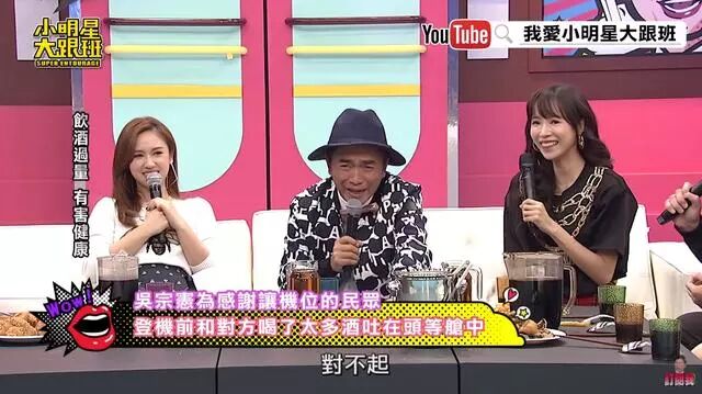 被灌醉的吴宗宪走路摇摇晃晃,好不容易上了飞机,椅子突然被往后一推,没想到他瞬间吐了出来:“我就真的身为一道彩虹了。”吴宗宪哭喊着道歉,直说“飞机上都是有头有脸的人,真是丢脸!”连女儿Sandy听了都忍不住摇头:“头等舱欸!我的妈啊!”