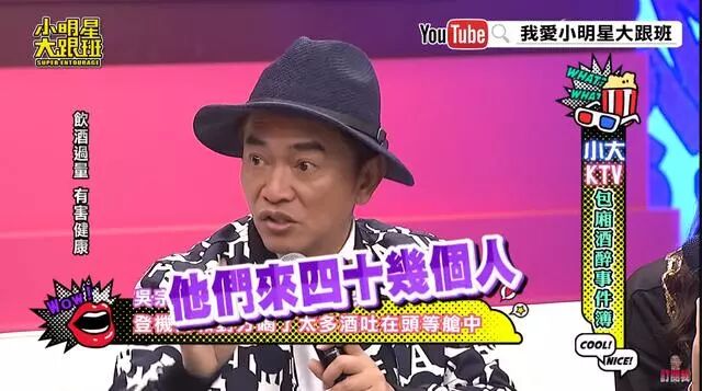 只是没料到,对方一找竟找来40多个人,来势汹汹!吴宗宪没在怕,对自己的酒量相当有自信,但对方竟拿出一瓶威士忌和白兰地,加上当时助理没有出面帮他挡酒,他只能硬着头皮上,心想“我只要这赶快喝完就可以走了”