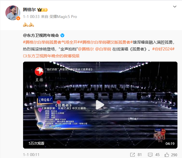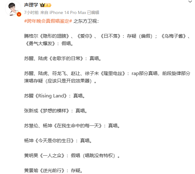 腾格尔遭打假 阜阳公众网 内地男星 2024-01-03 17:52:13 204 创作不易,用心坚持,欢迎请BaGua喝几杯爱心咖啡!打赏并支持本文 打赏并删除本文 刚刚发布:12月电费猛增?阜阳官方回应(点击查看)阜阳公布校外培训机构白名单(点击查看)1月3日,音乐博主“声理学”发布了自己对跨年晚会真假唱的个人鉴定,称腾格尔演唱的《隐形的翅膀》《爱你》《日不落》存疑(偏假);《乌梅子酱》《勇气大爆发》假唱。腾格尔和白举纲合唱的《孤勇者》同样存疑。据悉,腾格尔最近一次更新是1月1日,转发了东方卫视跨年晚会中他和白举纲合唱的《孤勇者》。微博下方的互动并不多,网友评论也多以夸奖和祝福为主。据上游新闻报道,记者联系了腾格尔助理,他在听到记者询问腾格尔假唱的相关话题后直接挂断了电话,同时也未回复有关腾格尔在跨年晚会被质疑假唱的相关短信。31日前后,“声理学”在跨年晚会播出后发布了不少关于演唱鉴定的博文,涉及湖南卫视、东方卫视、江苏卫视、浙江卫视等四大卫视。东方卫视跨年晚会鉴定。图源:声理学微博“声理学”在其个人鉴定最后强调:“此鉴定仅针对电视直播版本,至于现场版本如何,是否替换音源(这种可能性极低),不在讨论范围内。”他还表示,电视晚会在播出的时候,也会存在播出时替换录播的情况。例如他提到陈立农在浙江卫视跨年晚会的表演是节目组放的录播,歌手现场有演唱。并表示他只鉴定直播表演,录播表演一律不鉴定。“声理学”还发文称,江苏卫视是全员真唱,“孟子义的声音每出现一次,我对于江苏卫视跨年晚会的敬佩就增添一分”。孟子义演唱画面。“真唱”口号成为今年跨年晚会卖点之一。江苏卫视此前预热时便称“真唱,我们是认真的!”同时“界定”真唱为“全开麦”。对于孟子义对唱歌跑调的道歉,有粉丝调侃称“这次听出来是真唱了”。另一部分网友则认为:“不会唱就先练习,不能唱就专心做演员。”来源:综合上游新闻、当事人微博等往阜阳市中级人民法院公告!一定要认真看期太和县一镇党委书记被查要廖某达发条抖音,被阜阳警方盯上了闻阜城颍州中路这套房,1元起拍!评估价近60万微信最新改版他们说找不到阜阳公众网了所以……快为阜阳公众网加星标★这样大家就能第一时间接收到我们的推送消息↓↓↓ 创作不易,用心坚持,欢迎请BaGua喝几杯爱心咖啡!打赏并支持本文 打赏并删除本文 感谢您的支持鼓励,我会继续努力的!文章地址:用户邮箱:打赏金额:USDT 请输入数字点击”去打赏“,即可进行打赏支持本文章哦 腾格尔 发表评论