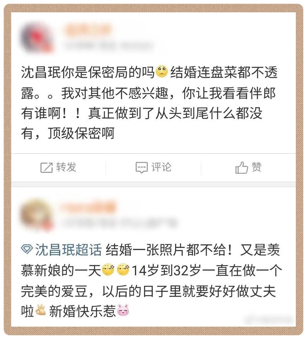 本以为最起码会有一两张照片流出吧,毕竟大家都想看看新娘的天仙美貌。结果沈昌珉仿佛“保密局”出身,婚礼现场全网无一张照片,甚至还上了热搜。