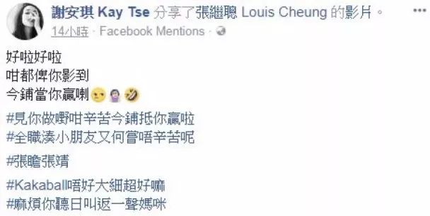 连老婆谢安琪都忍唔住转发咁有纪念性嘅Moment,仲留言赞老公威水:「好啦好啦,咁都俾(畀)你影到,今铺当你赢喇」谢安琪仲加上「见你做嘢咁辛苦今铺抵你赢啦」、「全职凑小朋友又何尝唔辛苦呢」、「Kakaball唔好大细超好嘛」、「麻烦你听日叫返(番)一声妈咪」等标签,非常搞笑!