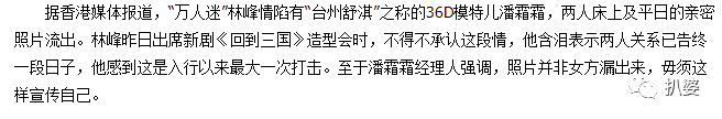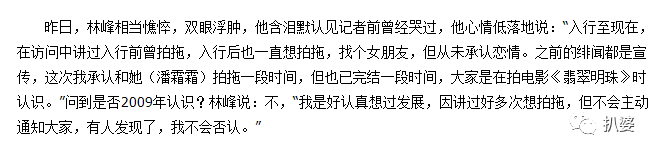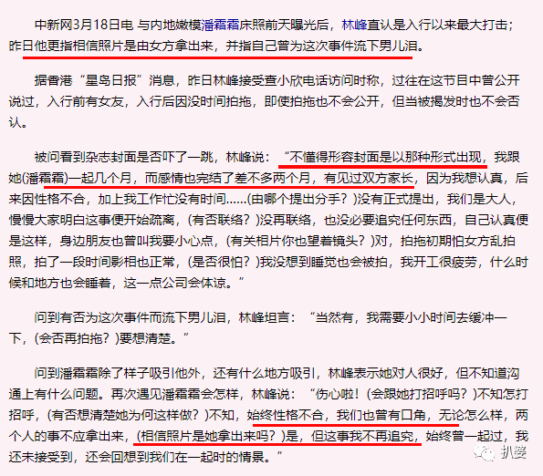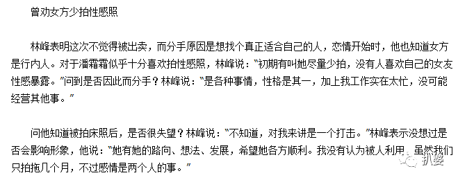 不过矛盾的是,虽然开始说自己和潘霜霜是和平分手,可接受查小欣采访时,林峰又直指床照就是潘霜霜自爆出来的,还说自己大度念旧情,所以选择原谅潘霜霜不追究。