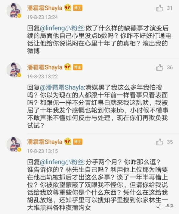 眼见同样网红出身的周扬青把粉丝众多的资深爱豆肾虚公子罗志祥撕的无力还手,豪门公子林峰的前前任潘霜霜也非常心动羡慕的凑热闹手撕渣男了。