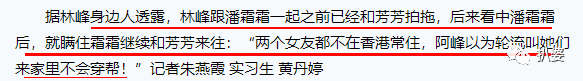 有知情人爆料说,芳芳是在潘霜霜之前就出现的,但后来林峰看上潘霜霜后就瞒着2个女生一拖二,觉得反正都不是HK人,轮流来就没问题。