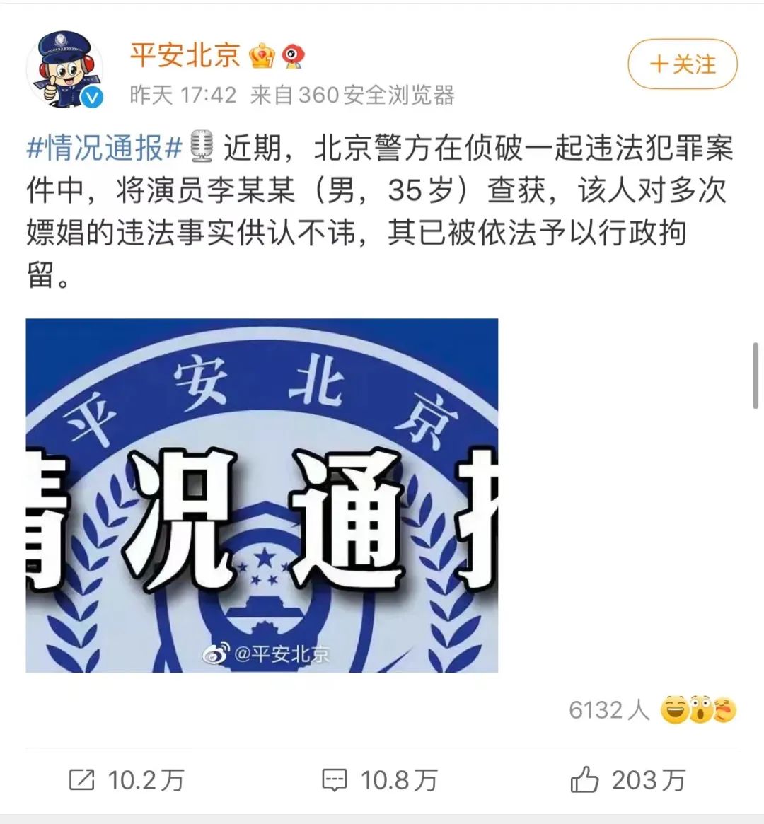 李易峰被爆,只是冰山一角 影探 内地男星 2022-09-17 11:59:31 358 创作不易,用心坚持,欢迎请BaGua喝几杯爱心咖啡!打赏并支持本文 打赏并删除本文 点击上方卡片关注我内娱是真可刑啊,日子越过越有盼头了。 2022年继烂片无数之后,娱乐圈终于踩着夏天的尾巴补上了上半年牢饭KPI。 2022年9月11日,警方通报演员李某某涉嫌多次违法嫖X,人民日报发文确认,李某某系演员李易峰。 明星的嘴,真骗人的鬼。 原来部分男演员演技高光时刻,都在辟谣上,真牢房都欠李易峰一座奥斯卡。 躺着挣钱已经满足不了内娱了。 从娱乐咖到法制咖,这场零片酬好戏,还要狂欢到几时?内娱“黄赌毒”网上有这么一句话,就像为娱乐圈量身定制: 金钱会让深刻的人更深刻,让浅薄的人更浅薄。 从这两年内娱的塌房频次来看,小视总结了娱乐圈三宗罪,建议以后明星收藏备用,方便按需辟谣: 内娱黄赌毒——嫖娼,吸毒,骗钱逃税。 (没错我们描述的是二十一世纪当代内娱,不是古早香港无间道) 还记得吴某凡的“监狱联欢晚会”吗? 去年夏天,吴某凡被爆出多起“网络选妃”,甚至涉嫌诱奸未成年少女。 当时的凡凡也是义愤填膺地微博辟谣。再一次验证了男明星的信任危机,往往背后都是无数警情通报垫底。 吴亦凡辟谣那个夏天大家最爱喊的口号就是“揪出下一个吴x凡”! 口号余音未灭,李云迪嫖X,就已经续上了热度。忧郁钢琴小王子,一朝变成违法男。 再让我们来回忆下那些年难忘的“扫黄打非”: 2014年5月16日,演员黄海波疑似被“仙人跳”嫖X,被北京警方当场抓获。 同年9月16日,《白鹿原》的导演、张雨绮的前夫,中国大陆第六代电影导演领军人物之一——导演王全安,在京非法嫖X被抓。 警情通报刺激的堪比小h文,连续嫖娼,婚内出轨、多人运动……王全安在骂声中,进监狱蹲了一年。这位“鬼才导演”的传奇,彻底停在了《白鹿原》。 王全安被抓现场 如果说下等人“纵欲”,那中等人的“赌”,比反胃更添愤怒。 娱乐圈逃税名单,拉出来,比“偷睡”名单还要长。 从范冰冰被曝光“阴阳合同”喜提“八亿女王”称呼,到邓伦偷逃税被迫缴并罚款1.06亿,一夜间全网查无此人。 数字已经苍白到只沦为一个膨胀的符号,背后是一个光怪陆离的行业隐藏在水面下的暴利与肮脏。身穿绫罗的蛀虫,躺在百姓血汗钱堆砌的酒令肉池上蚕食。 色与贪,一念天堂,一念地狱。 下等人“好色”,中等人“善赌”,那上等之恶,在于毒。 一个“毒”字,撑起了“朝阳群众”近十年江湖大名。明明是最容易塌房的人设,硬是坚挺至今。 记住下面这些名字,他们每个人的背后,都是一个“毒”字: 2014年3月19日,歌手李代沫涉嫌容留他人吸毒被北京市公安局朝阳分局依法刑事拘留; 2014年8月,演员柯震东房祖名,在北京一洗浴中心吸食大麻被警方查获;2018年11月26日,知名歌手陈羽凡被北京市石景山公安分局以涉毒违法逮捕; 同样榜上有名的还有张国立之子,演员张默,容留吸毒;演员高虎,违法吸毒! 有人一辈子籍籍无名,有人一夜爆红,名利兼收;有人烈日下站岗执勤,就着汗水吃一块隔夜冷馍,有人高朋满座,软玉在床,醉生梦死。 我曾不愿以最大的恶意,中伤演艺这个曾精彩纷呈,大师云集的行业——但你看看,这帮人都在干什么啊?? 好色的奸淫女性,贪财的做人民蛀虫,嗜毒的在缉毒警察坟头点起一株毒烟,在中国吸毒,等同毒贩帮凶! 你告诉我,这帮人到底都在做什么事啊? 揪出下一个李易峰,揪出下一个范冰冰,揪出下一个柯震东..... 从一爽等于208万,再到吴某凡监狱联欢会,还要纵容这笑话多久? 你方唱罢我登场,一出好戏,下一个揪谁? 别拿明星塌房当吃瓜李易峰塌房的热搜下,不少粉丝喊冤: “明星也是人,谁都有犯错的时候,至于封杀吗?” “李易峰有什么错呢?他没结婚也没女朋友,人家有本事搞到优质外围女,解决生理需求,牛。” 被一处污点抹杀的艺人,到底冤吗? 有一种叫做“倒影现象”的说法——公园里的宝塔很高,它在水里的倒影也就很长。 镁光灯下的明星,拥有大量的粉丝群体和超凡的影响力,他们的一言一行,折射着社会的道德守则和容忍底线。 倘若嫖X艺人仿佛无事发生,继续台前捞金,那么嫖X合法化,还会遥远吗? 倘若吸毒艺人不被封杀,照样霸占荧幕,那么该如何证明,我们禁毒的决心? 道德,并非恒定的标尺,而是流动的集体认知。 明星塌房,不是一笑而过的吃瓜事件,而是一次群体态度的亮剑。 如果我们步步后退,道德的反噬,必将蚕食你我的生活。 正如当年某爽代孕、弃养事件,引发全体网民的愤怒,也拉低人们的接受底线。 我们永远不要低估公众人物的影响力。 柯震东吸毒被抓后,“同款囚衣”竟然成了热卖产品。 宋冬野被封杀,有粉丝怒怼警察:“明星吸毒,关你们什么事?” 李云迪嫖X的词条下,有人认为不过被拘留而已,不是大罪。 明星的每一次塌房,都在磨损社会信任、刷新道德底线。 只有让他们付出沉重的代价,才能警戒他人、重申规则,这容不得蒙混过关。 我们知道,权利与义务,从来不可分割。 享受天价片酬、高额红利的明星,不该拒绝承担该有的义务: 微博签名是“好好做人,认真拍戏”的邓伦,转身漏税1.06亿。 一个月薪4000元的普通人,不吃不喝2083年,才能攒够这笔钱。 它可以换算成530所希望小学、8万支“九价HPV”疫苗、17000套防弹衣、5万株的树苗…… 担任过禁毒大使的柯震东,本该宣传毒品