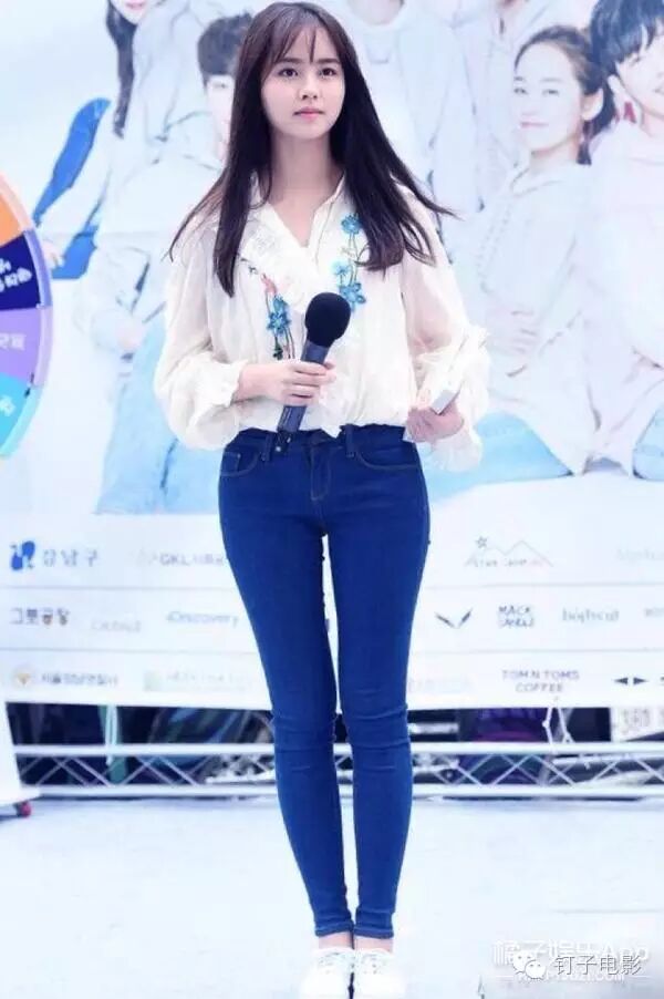 略带甜美的上身用牛仔裤搭配让整体造型透着学生气的青涩,非常符合金所炫的整体气质。