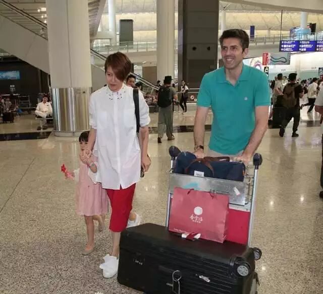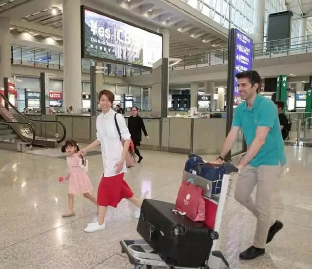 梁咏琪身穿白色衬衣搭配红色半身裙,从造型上看梁咏琪依旧十分动人。老公在一旁推着行李,这一位西班牙老公的动作十分帅气,同行的一家三口中最抢眼。