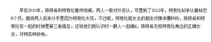 据爆料,陈妍希和柯有纶相识于KTV,相当于是一群朋友唱K,但陈妍希就看中了柯有纶,无奈那时柯有纶名草有主不好下手,所以陈妍希就只能暗戳戳的对着柯有纶使劲儿放电,所以这个已经属于是“插足”了吧。
