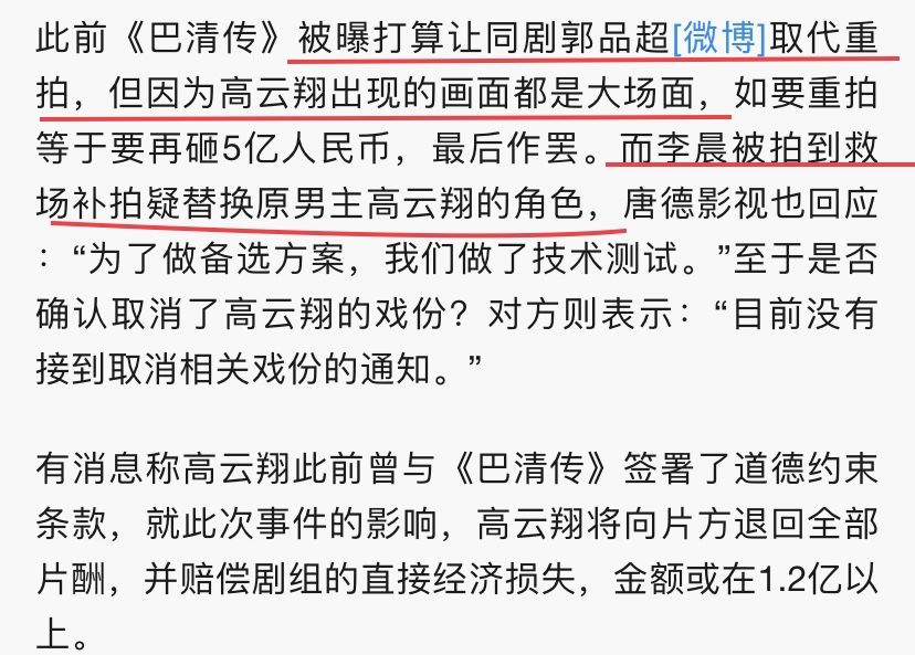 《巴清传》剧组紧急想了各种应急方案:如把男二郭品超扶为男一,或者让范冰冰的男友李晨顶上。