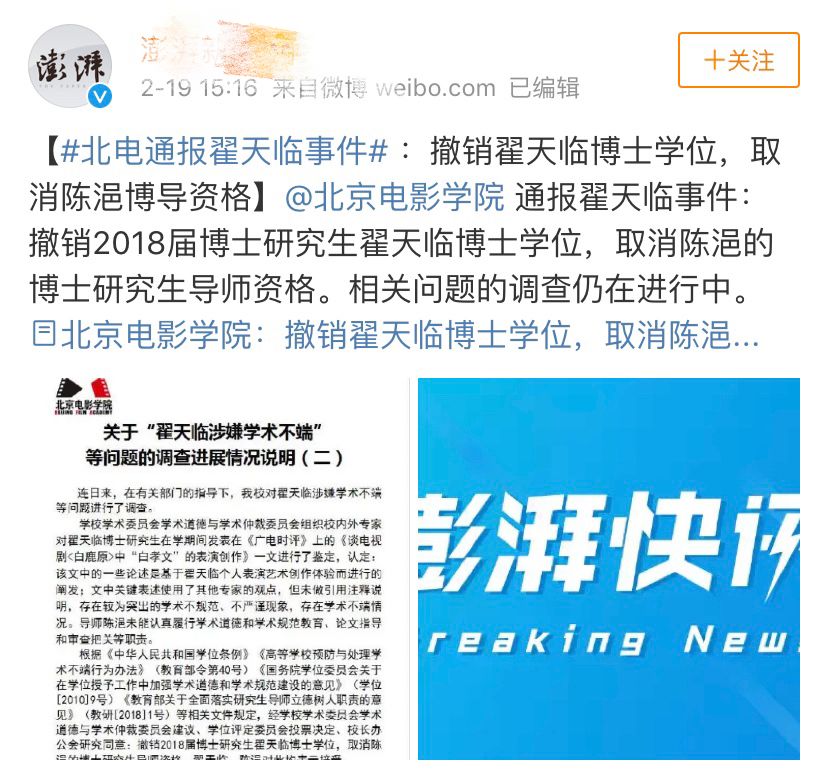 现在翟天临从“翟博士”降级为“翟硕士”,其他有关问题还在调查中。