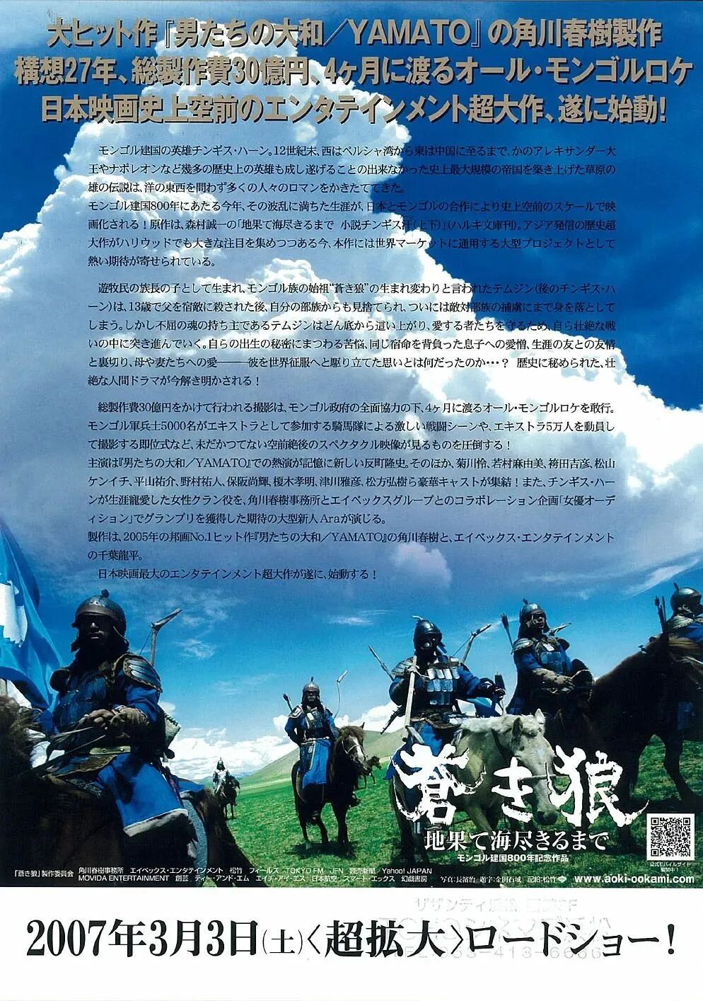 《苍狼:直至天涯海角》是松竹映画公司出品的历史、传记、战争类型电影。由泽井信一郎执导,反町隆史、松山健一,若村麻由美、菊川怜、保坂尚希等人主演 。于2007年3月3日在日本上映。