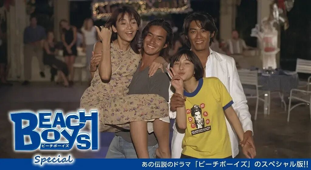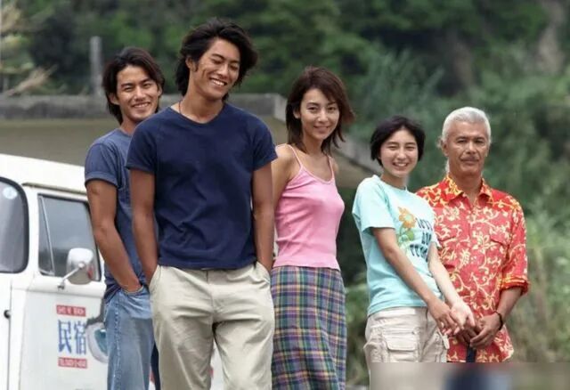 反町隆史搭档竹野内丰,稻森泉,广末凉子,两位大帅哥魅力四射,竹野内丰也有179cm的身高,两位型男都拥有模特身材,美丽的稻森泉(左3)同样是模特出身,俊男美女的组合,让美好的回忆永远留在了那年那个美丽的海滩。