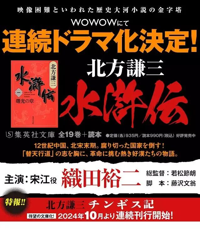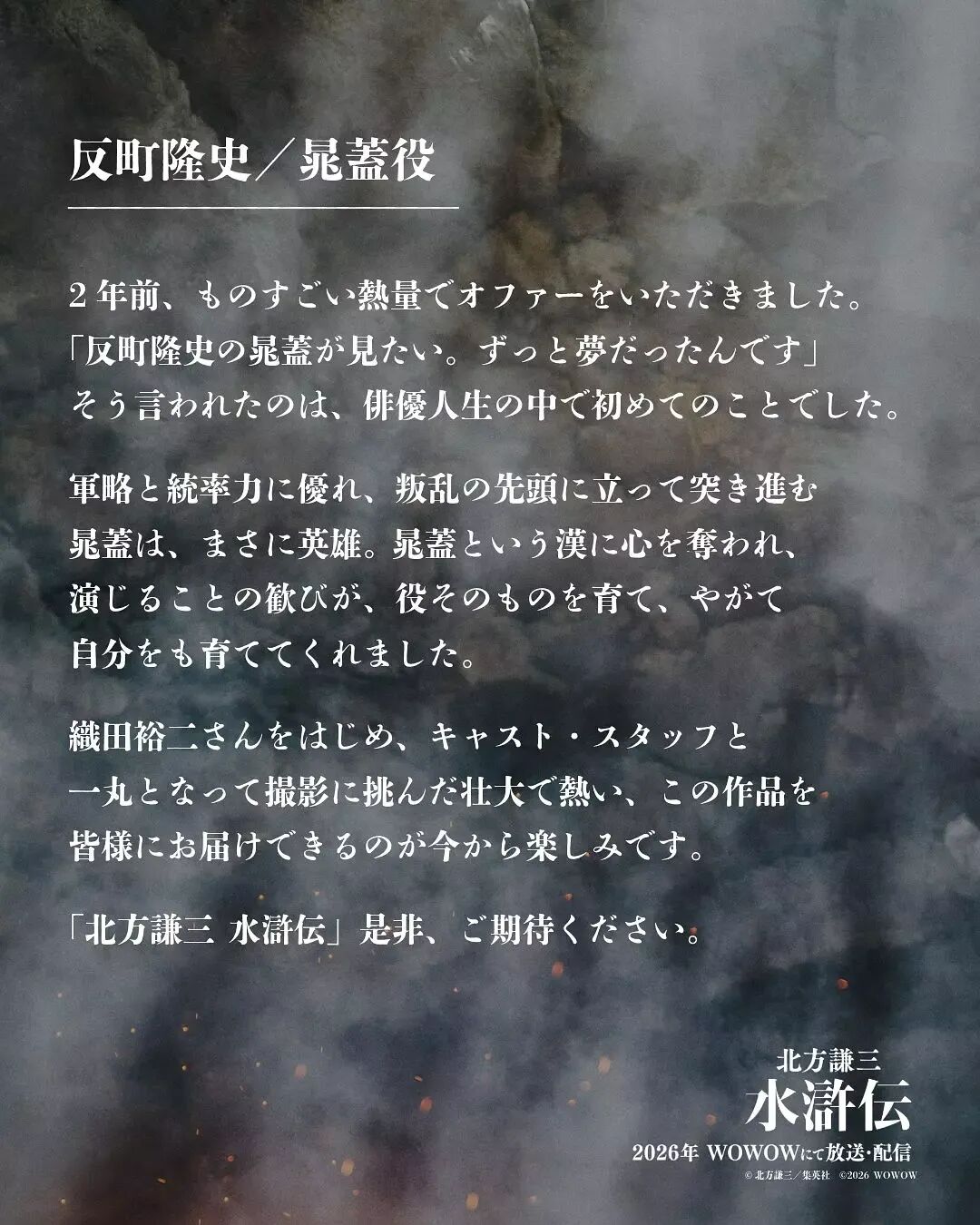 好了,回顾了多部反町隆史经典的作品,也是我个人心里面比较喜欢的,终于聊到正题,日本方面于2025年开启了日本版《水浒传》的制作企划和拍摄。不过这个水浒传跟中国四大名著的原版有些不同,这个是日本推理与冒险小说作家,北方谦三先生所著,累计发行量突破1160万部,在文学史上散发着孤高光辉的北方谦三的历史大河小说《水浒传》,全19卷将在WOWOW完全映像化。该剧改编自北方谦三原作、施耐庵同名小说,故事讲述了因忧心时代命运而选择以法外之力践行正义的"边缘人"们的反叛史诗,描绘了对抗不公与伙伴羁绊交织而成的壮阔群像。