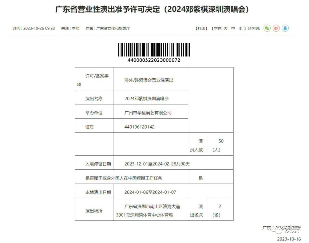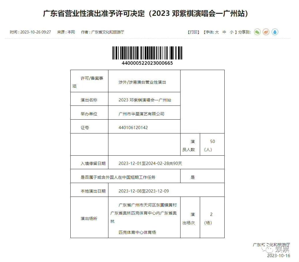 邓紫棋演唱会终于要来了广州站、深圳站已获批。广州站作为巡演首站将于12月8-9日举行,深圳站将于2024年1月6-7日举行。