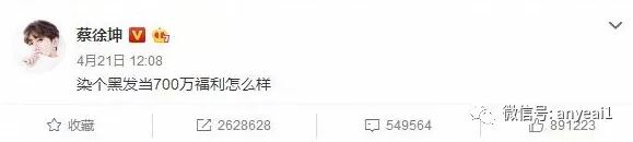 在微博粉丝数突破700万之时,蔡徐坤说要把头发染黑作为福利,引起了粉丝们的又一波高潮。