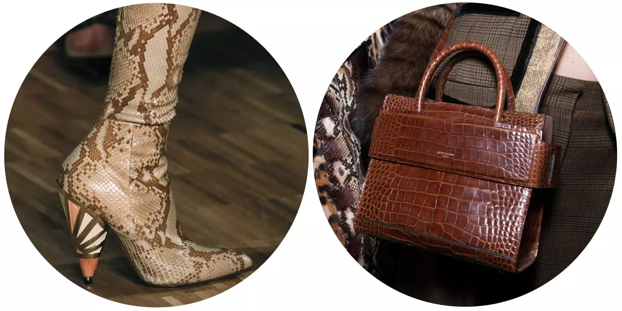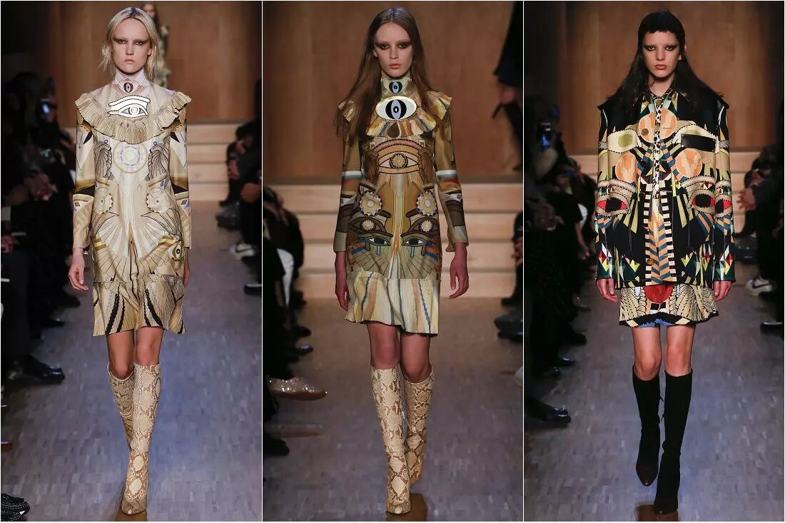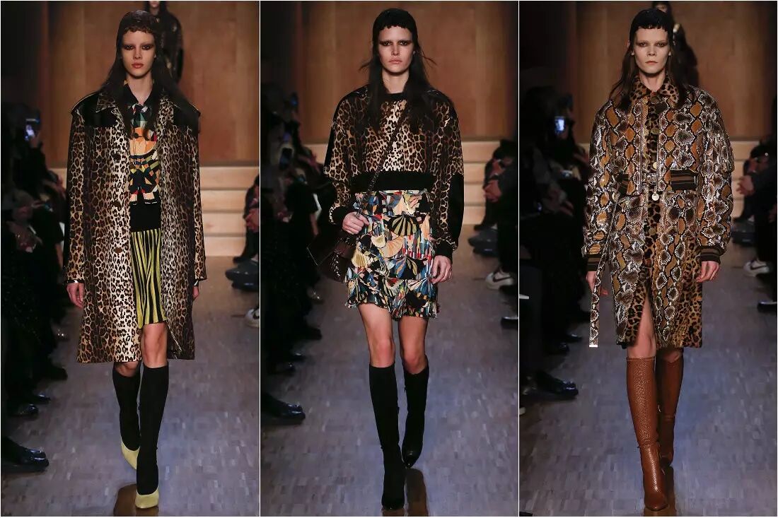 2016秋冬系列,Riccardo Tisci将豹纹蛇纹等动物纹元素搬回了时尚舞台,豹纹皮草大衣、皮裙、蟒蛇纹皮靴More is More的搭配野性十足。万花筒的几何图案组和眼睛的图腾、宫廷风的套装充满华贵魅惑。