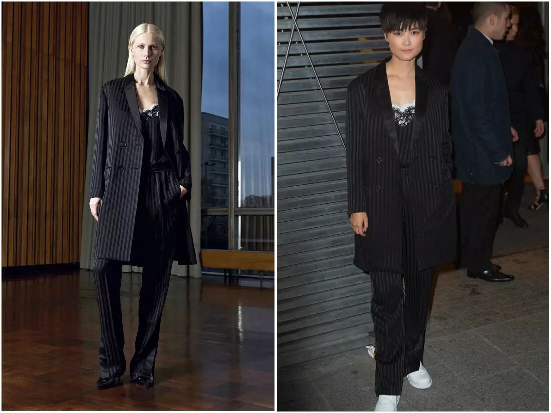 李宇春身着Givenchy2016早秋系列的暗条纹西装,搭配Riccardo Tisci送给她的生日礼物,Givenchy CL Sneaker限量版。