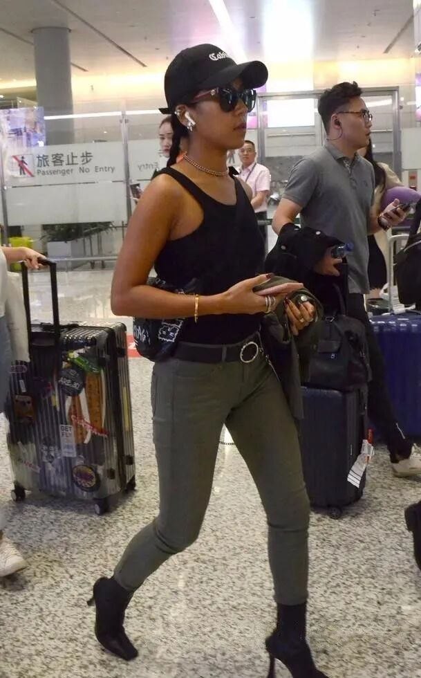 黑色的背心显得吉克隽逸,看起来好壮,很明显,这件衣服不是那么适合她。因为衣服实在是太小了呀,下半身搭配的裤子是那种绿色的。显得腿特别的粗壮。