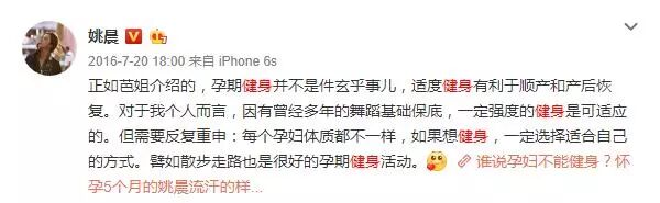 姚晨此前孕期健身曾被部分网友怀疑这样做难道不会大动胎气吗,后来姚晨发微博解释:“孕期适度健身有利于顺产和产后修复。对于我个人而言,因有曾经多年的舞蹈基础保底,一定强度的健身是可适应的。但每个孕妇体质都不一样,如果想健身,一定选择适合自己的方式。”