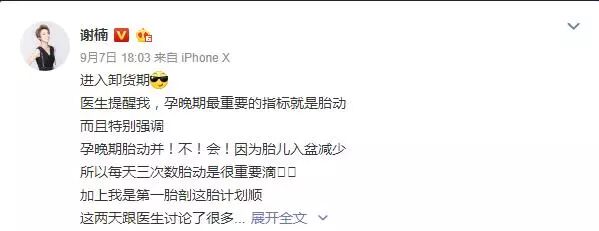 月初进入卸货期时谢楠拍了张照片,孕肚正面看起来不算特别大,不过谢楠在评论区回复网友说侧面看其实挺大的。