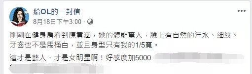 还有网友在健身房偶遇陈意涵,这位网友表示怀孕中的陈意涵体能依旧很惊人!感觉陈意涵孕期的运动强度跟大部分孕妇比较起来真的算是蛮大了。