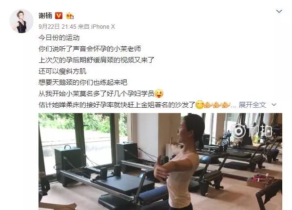 24号生下二胎儿子“无虑”的谢楠,怀孕期间一直在做婵柔等各种运动,直到产前两天都还在坚持。