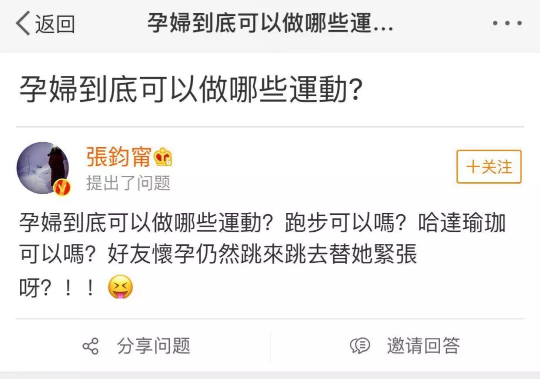 不仅仅只有网友担心陈意涵跑得太猛,好友张钧甯看到陈意涵怀孕了还老蹦跶让她感到十分紧张,13日那天张钧甯在微博发起提问,问网友们孕妇都能做些什么运动。