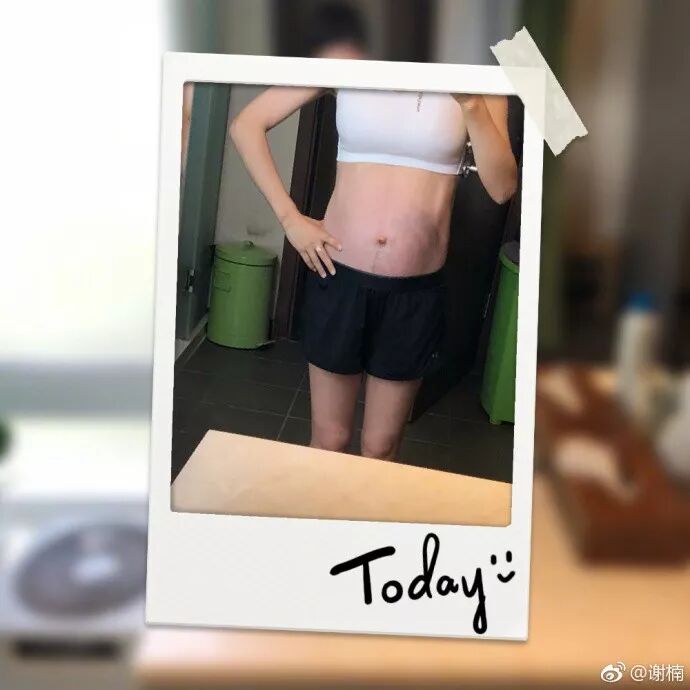 怀孕差不多七个月的时候,谢楠的孕肚还能看到马甲线的存在……