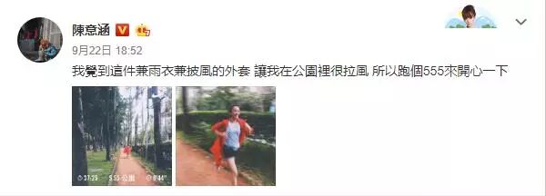 上个月“元气少女”陈意涵领证结婚宣布怀孕,如今已升级成准妈妈的她不改元气好动本色,22号那天在微博上po了两张自己跑步的照片。