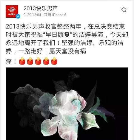 然而29日中午时分,“芒果妈妈”发微博称:“两年前,《快乐男声》让大家知道了一个导演的名字洁婷。十分钟前,洁婷永远地离开了我们!一路走好!”“坚强的洁婷、快乐的洁婷,一路走好!”