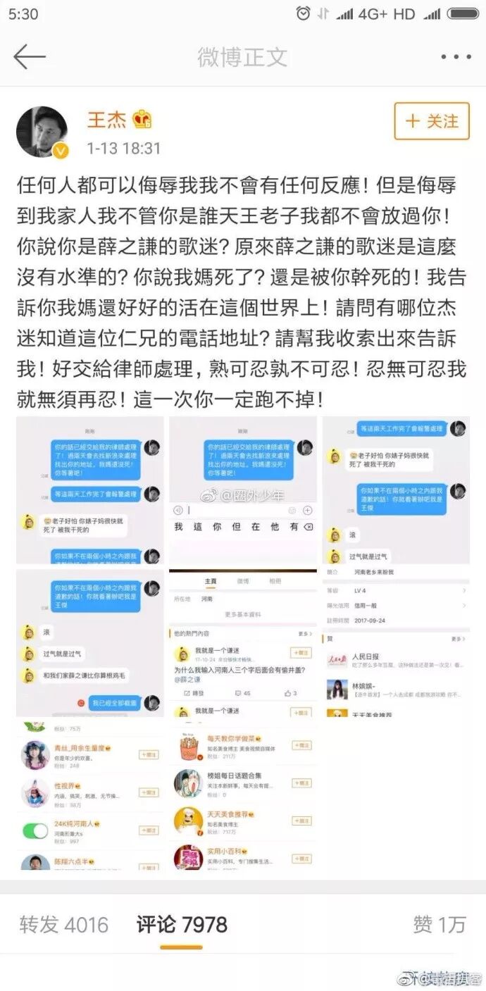 这越琢磨越生气,不行,非得给丫逮起来干一顿不行!再一瞅,薛之谦粉?看来网传的薛之谦粉丝素质不好是真的。一下子就气炸了,赶紧发个微博表示强烈谴责。