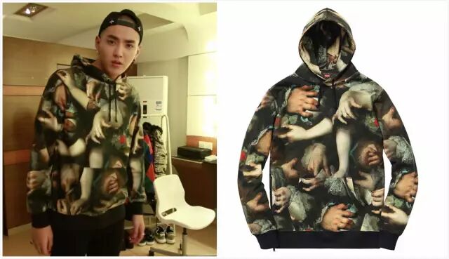 吴亦凡身穿这一件Supreme x UNDERCOVER的卫衣正是Supreme 2015ss的焦点之作。继Supreme上一次使用油画作品《le bain》的元素制作卫衣后,在这次强强联手中使用法国画家 Nicolas de Largillière 知名画作 《A Study of Hands》 作为素材,以艺术名作再次引起粉丝们的共鸣。