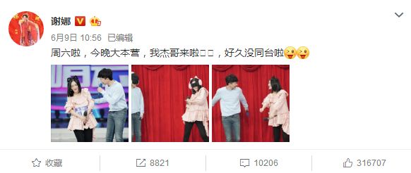 6月9日,谢娜在微博发布一则消息,“周六啦,今晚大本营,我杰哥来啦,好久没同台啦”,这是谢娜张杰二人升级成为爸妈之后首次的同台,网友都称今晚的节目肯定逃不过这波狗粮了。