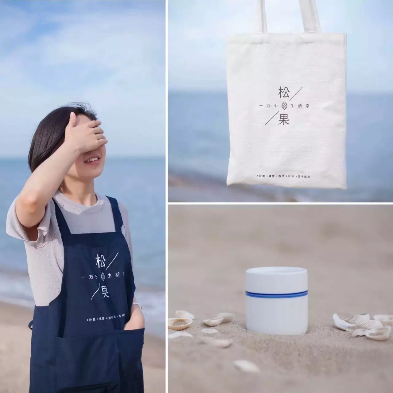 蓝布围裙、帆布袋、蓝边瓷杯