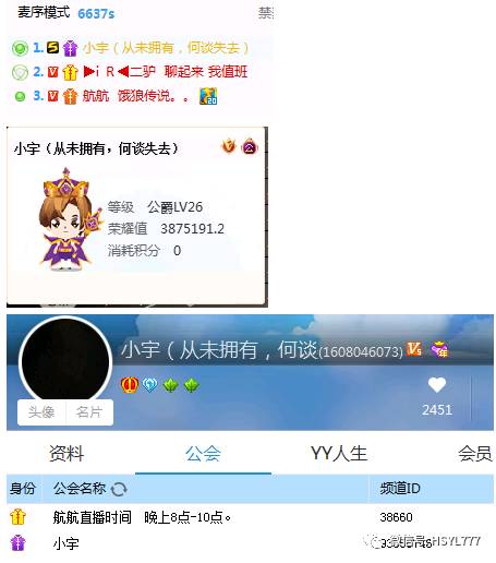 当然这些都是过去式,今天要说的是土豪小宇,公爵一枚,很低调不爱要画面,守护小不点达半年之久。他自己称在YY消费了六百万,今天出镜直播,酗酒抽烟神伤落泪,而且马甲改成了:从未拥有,何谈失去?疑似与小不点闹掰被甩。