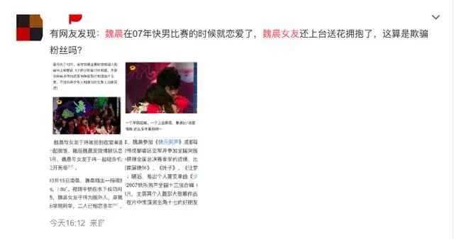 7日,有网友发现,2007年通过快乐男声出道的男歌手魏晨,其实在比赛期间就有女友。他的女友甚至还曾上台送花拥抱了,如此明目张胆的行为,被网友们质疑他也曾"欺骗粉丝"。