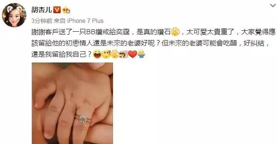 当然,虽然胡杏儿出于对客户的尊重给儿子戴上了这枚钻戒,但是毕竟儿子还小,手上戴着这样一枚戒指很不安全,为此,胡杏儿也想为奕霆收藏起来。而想到要收藏这枚戒指,胡杏儿也开始纠结这枚戒指究竟是要留给儿子未来的初恋情人还是未来老婆,亦或是谁都不给留给自己呢?这样一想可是让胡杏儿犯了难,为此也开始向网友求助。