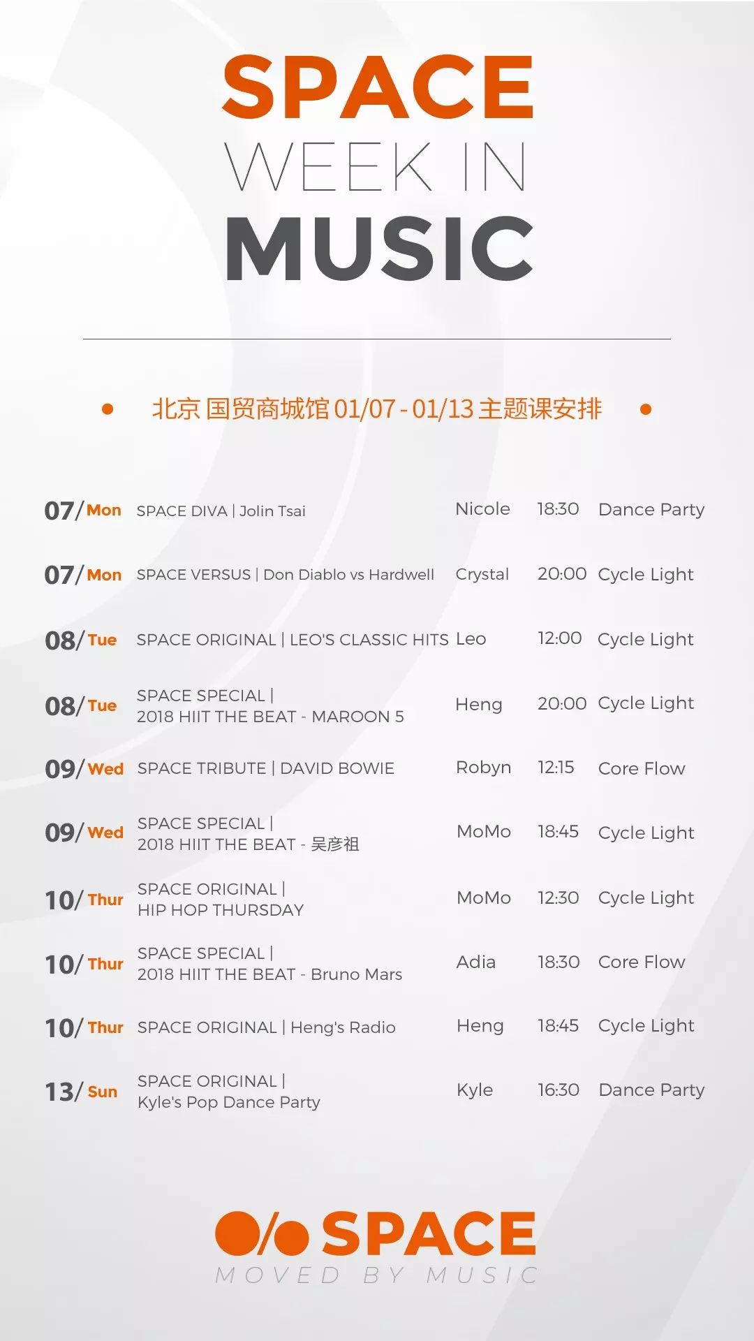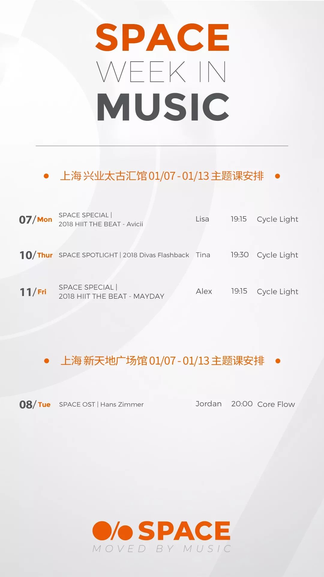 本期主题歌单非常唤醒耳朵,结合经典,同时把活动相关热门歌曲以及乐坛前沿的流行风潮速递给大家:有为自己开启全新时代的女王蔡依林,有 Don Diablo vs Hardwell 作为治愈假期综合症的律动良药!还有 2018 Divas Flash Back 女性力量的代表回顾!男声势力不容小觑:有声入人心,演唱会质量始终在线的张学友,有延续 HIIIT THE BEAT 热力魅力的华语男子组合代表五月天以及和 SPACE 有着特别羁绊的男神吴彦祖,还有大师 Hans Zimmer 的经典配乐盛宴,以及 David Bowie 音乐史上不可磨灭的艺术家。打开 APP 报名吧!