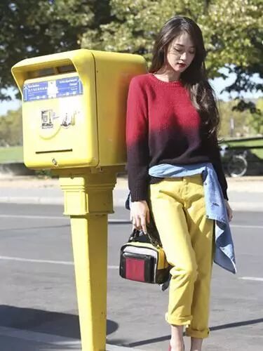 陈乔恩一件渐变色的套头毛衣配黄色长裤,腰间系一件衬衫十分吸睛,给人感觉休闲闲适 。