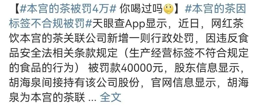 其中连锁奶茶店“本宫的茶”,近期因违反食品安全法被罚款四万元。