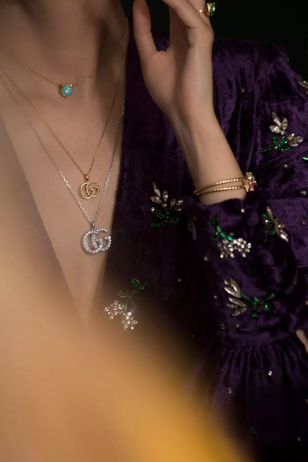 这一套充满华丽复古感的首饰是GG Running系列。这个系列的项链很适合叠戴,不知道怎么玩叠戴的同学可以考虑直接买一套,Gucci把不同材质和颜色搭配得自然又轻松,容易营造出层次。▼