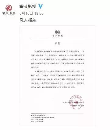 昨晚在吴亦凡工作室发布声明之前3分钟,耀莱影视先行发布了一条声明,并配文“凡人耀莱”,在吴亦凡之后发布的声明中配文则是“我是凡人”,双方间的默契配合,向大家宣布了这一消息。