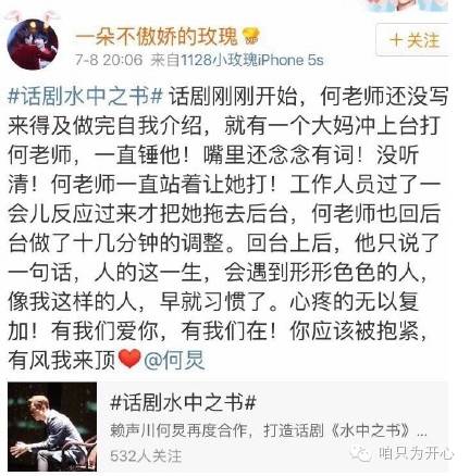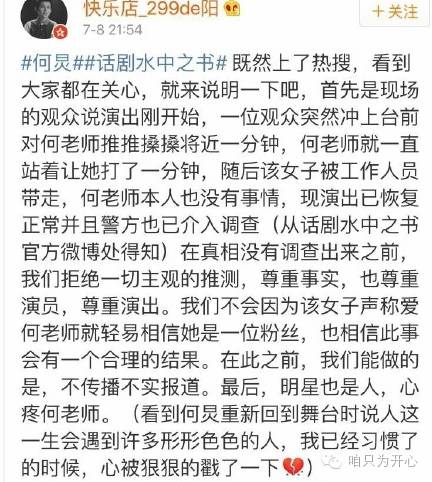 网友的微博还原了事情经过:“话剧刚刚开始,何老师还没写来得及做完自我介绍,就有一个大妈冲上台打何老师,一直锤他!嘴里还念念有词!没听清!何老师一直站着让她打!工作人员过了一会儿反应过来才把她拖去后台,何老师也回后台做了十几分钟的调整。回台上后,他只说了一句话,人的这一生,会遇到形形色色的人,像我这样的人,早就习惯了。