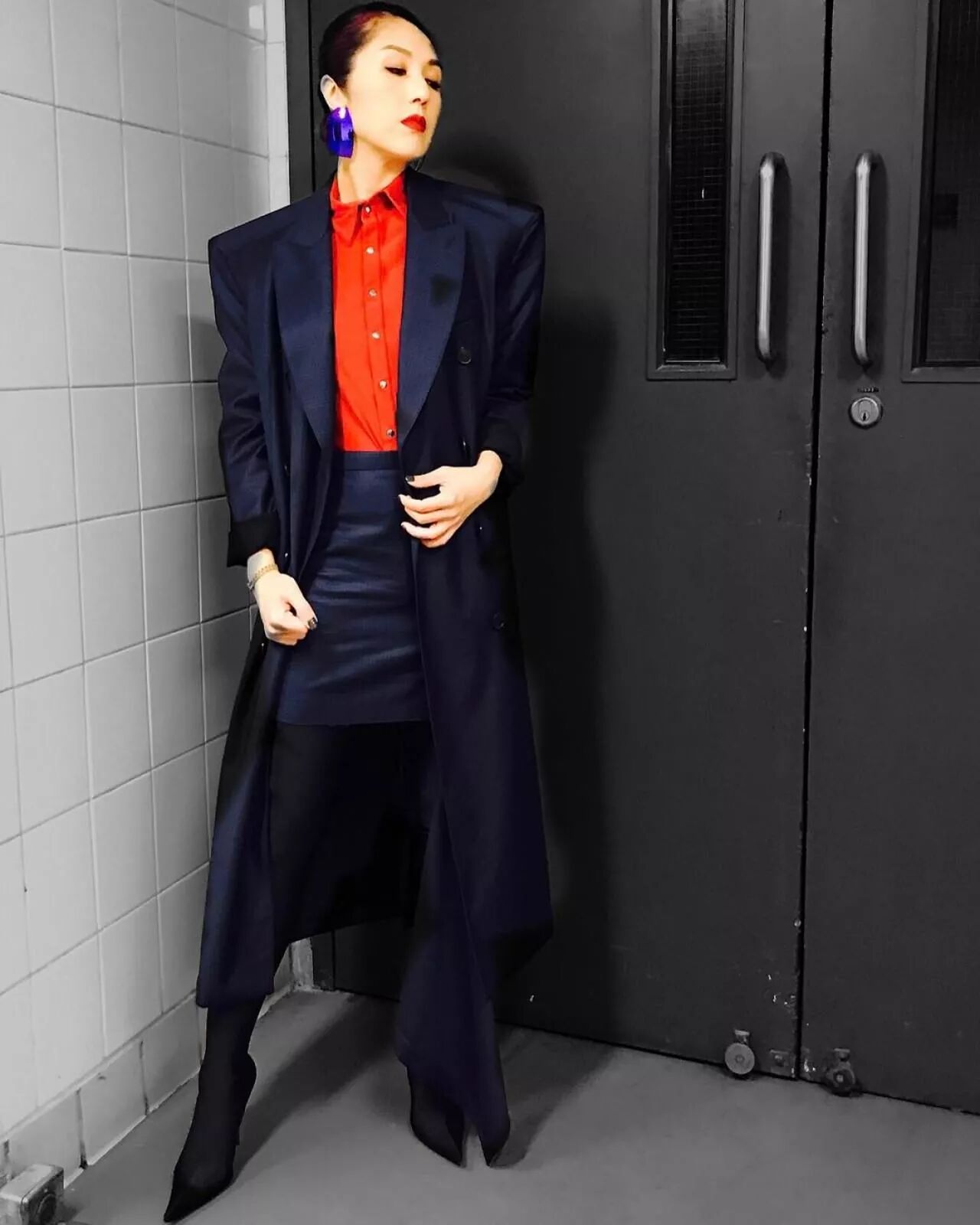 超闊的肩位充滿陽剛味,但長外套底部的波浪剪裁,再配合鮮紅襯衫和巨型耳環,充滿復古的中性魅力。(instagram: yeungchinwah)