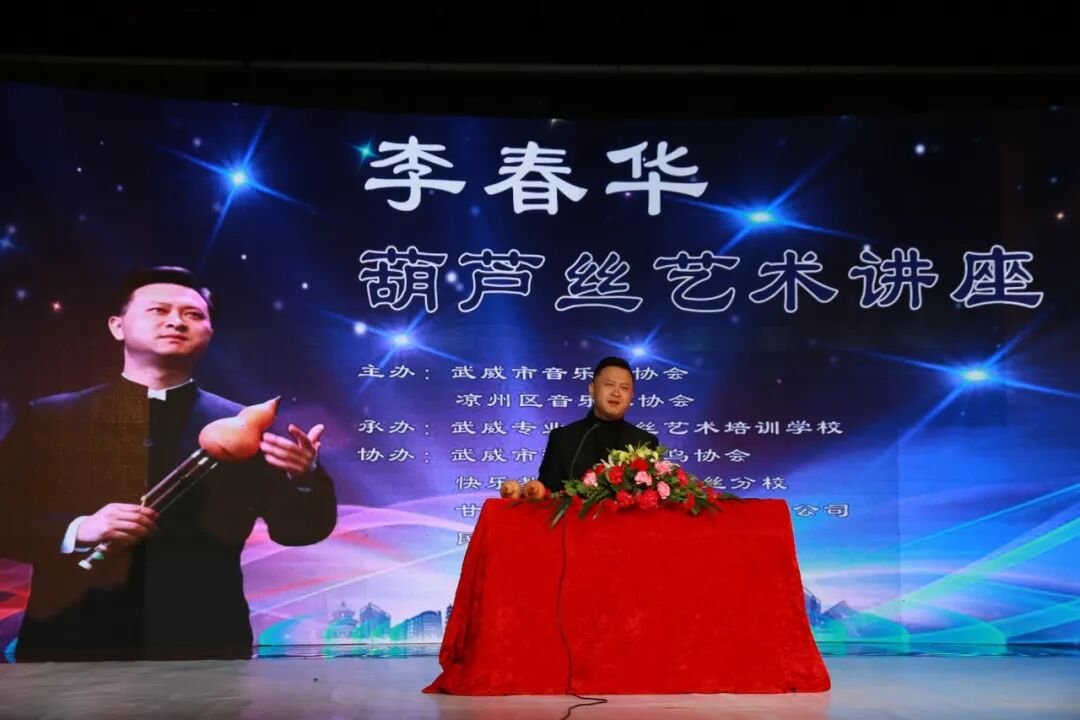 2018年2月8日下午两点,“丝韵凉州”——迎新春葫芦丝专场音乐会在甘肃省武威市三合苑隆重上演。本场音乐会由甘肃武威市音乐家协会、凉州区音乐家协会主办,武威专业葫芦丝艺术学校承办。音乐会开始前,李春华先生作了葫芦丝艺术专题讲座。