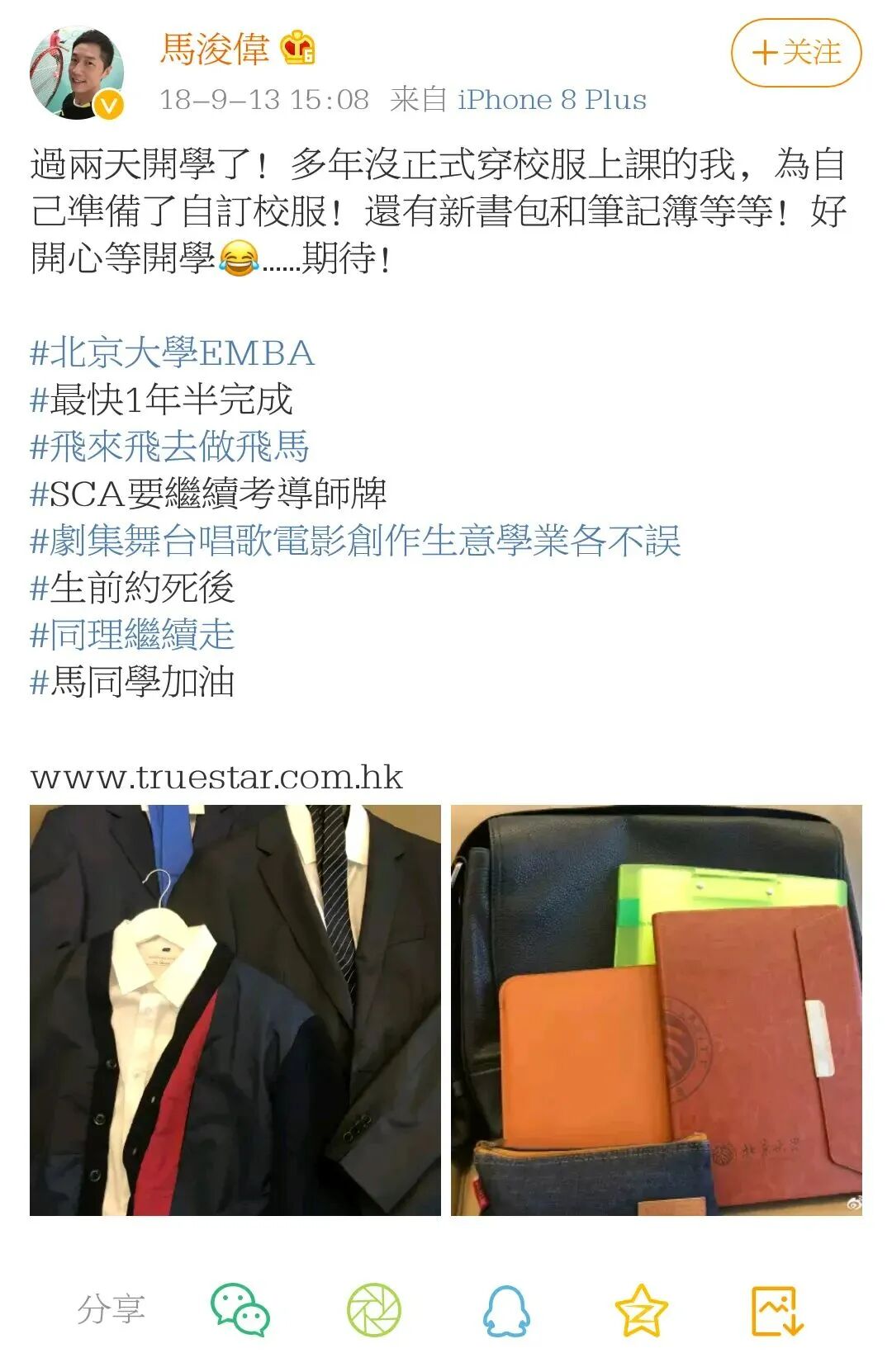 2018年9月,马浚伟发微博称,自己已入学北京大学光华管理学院攻读EMBA学位,大家还有一种看热闹不嫌事大的心态。2020年7月,当马浚伟宣布已通过光华管理学院硕士研究生学位论文答辩,顺利毕业时,人们才真正意识到,人家根本不是玩票来的。