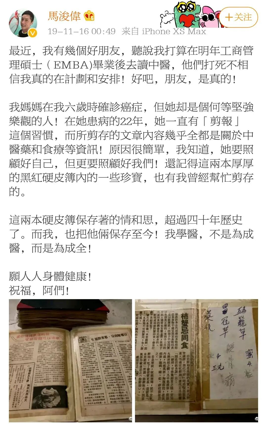就这样,硕士毕业论文查重率只有0.77%的“艺人学霸”马浚伟,在49岁拿到了北京大学光华管理学院EMBA之后,再度开启他的学术之旅——2020年,他收到了香港浸会大学中医药学院的入学通知,并于9月份入学。