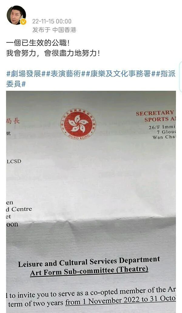 据悉,马浚伟已入职中国香港特区艺术发展局,成为演艺专业委员会下辖的戏剧类委员,任期2年,从2022年11月1日到2024年10月31日。