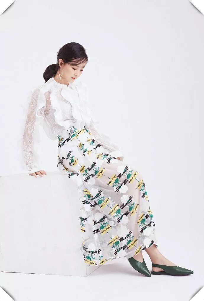 穿着白色的蕾丝衬衣,微透的纱质半身裙,搭配一双绿色的平底鞋,真是清新淡雅的一身呢,白色的衬衣蕾丝质感,有一种无言的性感呢,印花的半身纱裙让她的双腿看起来若隐若现的很性感,墨绿色的鞋子有一种贵气,很完美的一身呢。